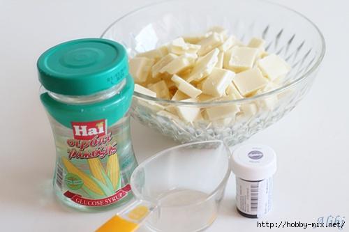 Цветы тоже из белого шоколада, только к нему добавлены сироп глюкозы, кукурузный сироп и краситель.