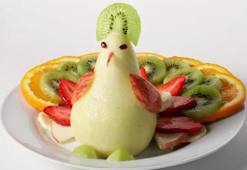 Очень интересный вариант подачи – фруктовый павлин, туловище которого легко сделать из груши, а «хвост» можно сделать бесконечным – просто выложите рядами нарезанные кружками любые фрукты.