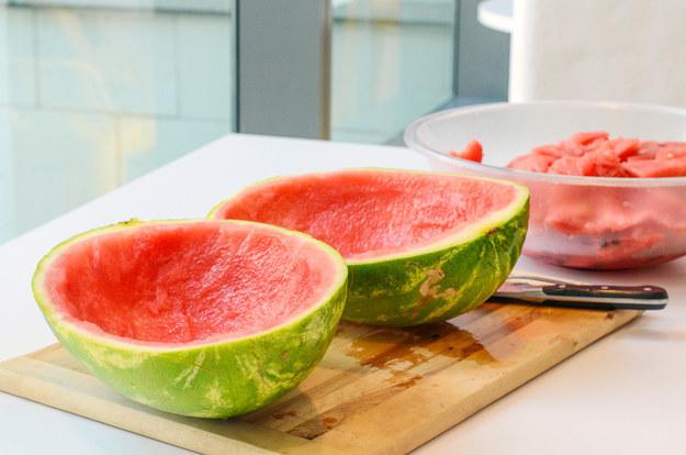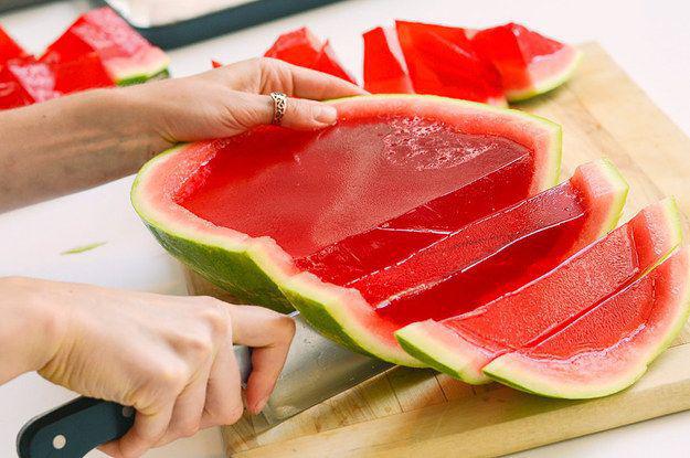 Возьмите 5–7-килограммовый арбуз. Разрежьте его пополам. Извлеките мякоть. Корка будет служить формой для желе.