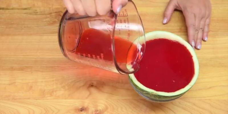 Тщательно перемешайте и залейте этой жидкостью половинки арбуза.