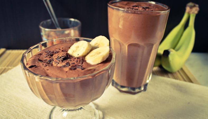 - Смешайте бананы, какао, мёд и молоко в блендере до однородной массы.