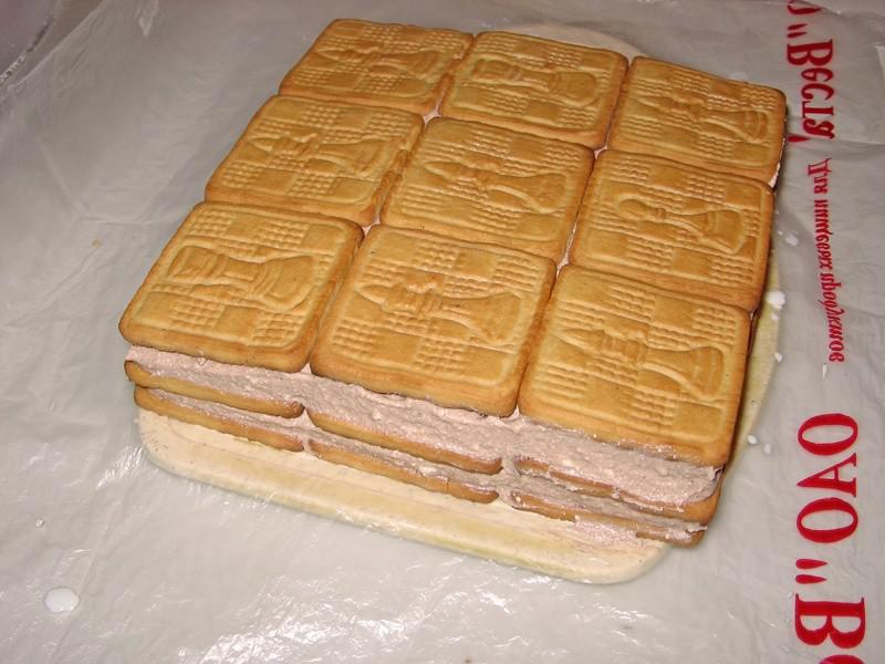 Поверх «фундамента» ровным слоем кладем наше «тесто», примерно половину. Выкладываем «второй этаж» печенюшек (вымоченных в молоке, не забываем). Должно получиться примерно следующее: