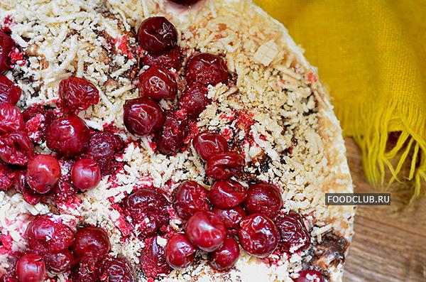 Сверху я посыпала торт натёртыми на тёрку сливочными вафлями с начинкой (5 шт.) и ещё одним слоем выложила вишню.