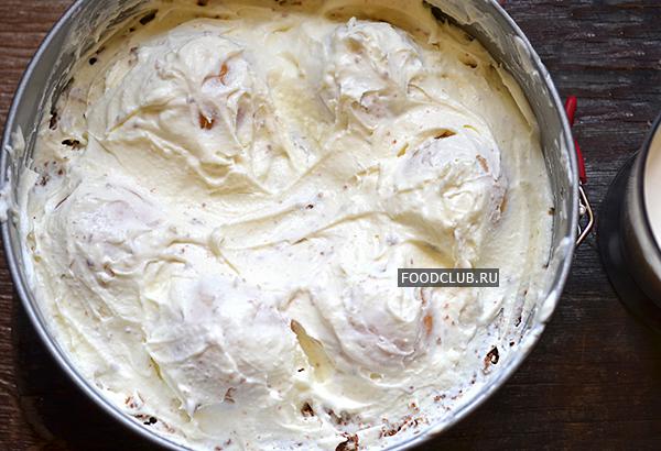 Второй крем вылить на на взбитые сливки. Поставить торт в холодильник для застывания. Если оставить торт в холодильнике на ночь, то корж впитает в себя влагу и не будет крошиться.