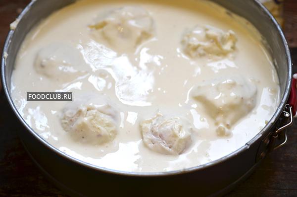 Выложите на него консервированные персики. Если персики мягкие, то укладывайте их половинками, как на фото. Если они более твёрдые, то лучше разрезать на более мелкие кусочки.