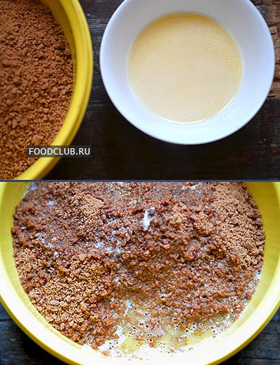 Для того чтобы корж не рассыпался, печенье нужно соединить со сливочным маслом. Для этого растопите масло. Быстрее всего это сделать в микроволновке, где за 20 секунд масло растопится. Влейте масло и размешайте. Руками размешивать будет удобнее, как бы перетирая крошку с маслом между пальцами. Тут очень важно, чтобы масло разошлось равномерно по всей крошке.