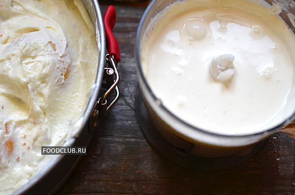 Выложите крем на корж с персиками.