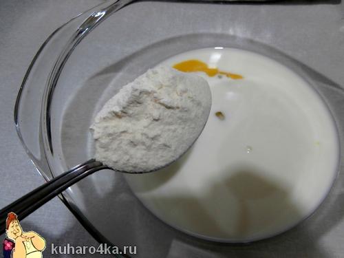 Берем специальную посуду для микроволновой печи. Смешиваем в ней молоко, желток, сахар, понемногу добавляем муку, хорошо перемешивая.