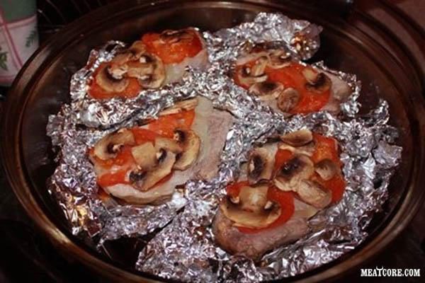 6. Мясо в фольге с грибами и помидорами