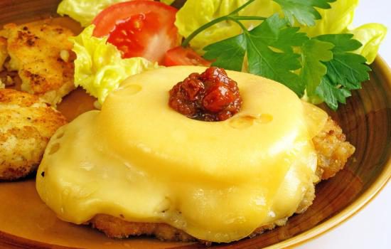 3. Запекать в разогретой до 180 градусов духовке в течение получаса. Мясо по-французски с ананасами готово.
