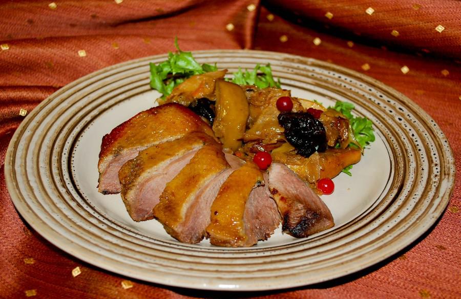 Утку поместить на тушеные фрукты и вынести гостям на показ.