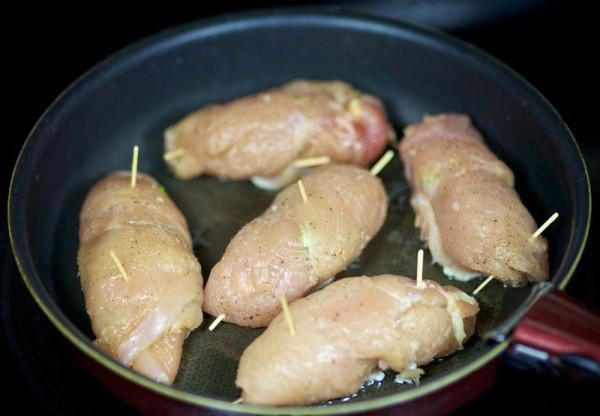 Начинку заворачивать в подготовленные пластинки курицы, закрепить зубочистками или нитками. Обжарить на растительном масле до золотистой корочки.