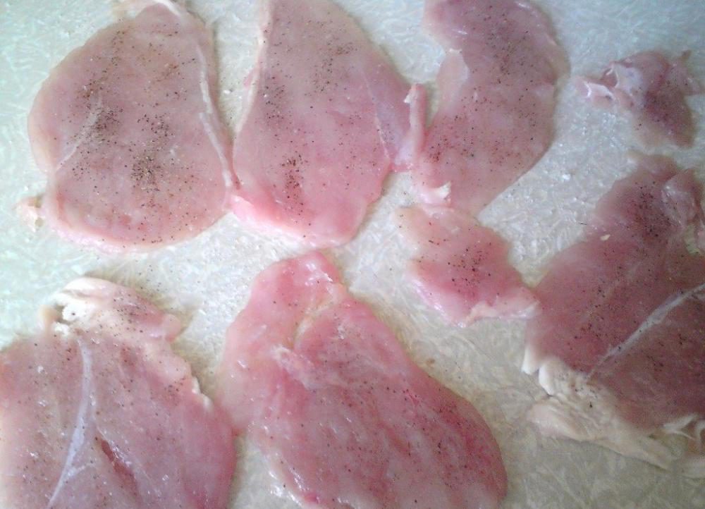 Куриную грудку разрезать на тонкие пласты (у меня с одной грудки получается 6-8 шт.), слегка отбить, посолить, поперчить и отложить на некоторое время...