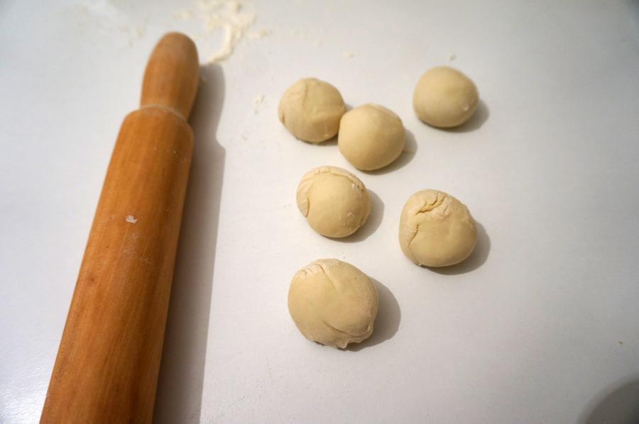 Делим тесто на такие круглики, потом раскатываем скалкой. Главное умеренно раскатать, чтоб тесто не было сильно тонким или толстым, ориентируюсь для начала, чтоб через раскатанное тесто чуток виднелся рисунок от скатерти =)