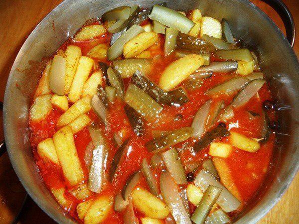 9. Как подошло время, закладываем картофель и огурцы в кастрюлю, добавляем соль, если надо – перец и тушим до готовности картофеля, обычно не больше 10 минут. Примерно 5-7.