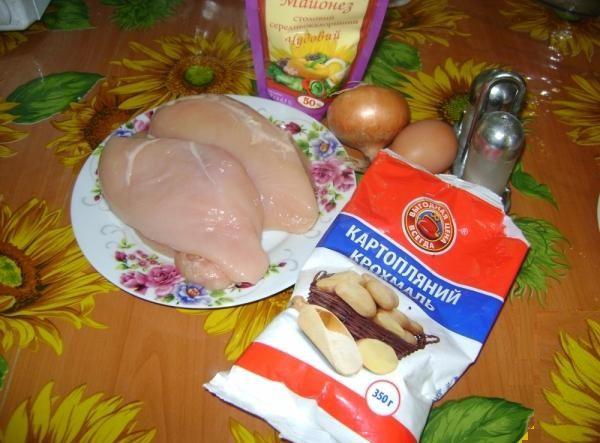 В заранее порезанное мясо добавить необходимое количество майонеза или сметаны, куриное яйцо, крахмал картофельный, натертый лук, соль и перец по вкусу.
