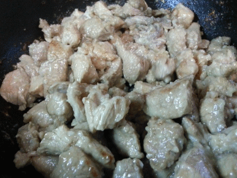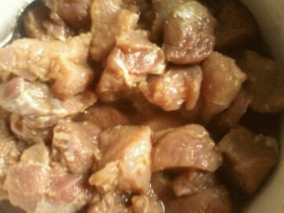 Мясо порезала на небольшие кубики и залила маринадом, хорошо перемешала и оставила, чтобы настоялось.