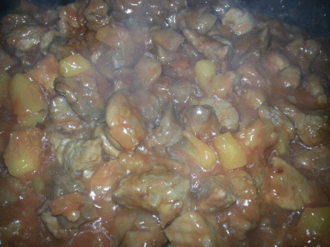 Обжарила на среднем огне минут 7 - 10, добавила ананасно-овощную смесь, примерно полстакана ананасного сока из банки, чуть-чуть досолила и тушила под крышкой еще минут 5.