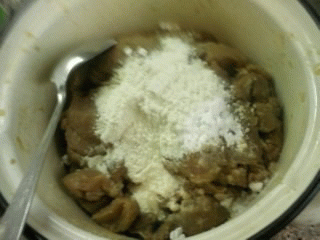 С мяса слила маринад, добавила муку и крахмал, хорошо перемешала...