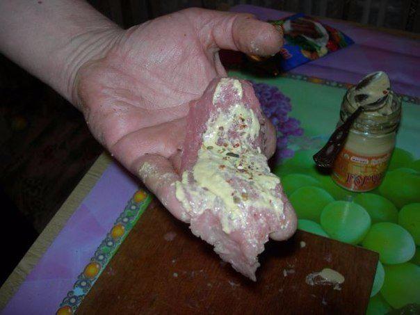 3. Горчица — очень важный момент в приготовлении блюда. Важность момента заключается в том, что если намазать горчицей каждый кусок мяса — весь сок останется внутри и куски будут ооочень пропитанными, свежими и аппетитными. В принципе, после приготовления горчица практически не чувствуется, но и злоупотреблять не стоит.