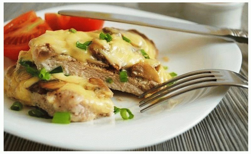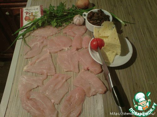 Осталось их только слегка отбить, сдобрить любимыми специями, обвалять в панировке или просто обжарить по минутке с каждой стороны, сверху уложить слой жареных грибочков с сыром луком и чесноком, натереть сыра и в микроволновку на пару минут, чтобы схватился сыр!