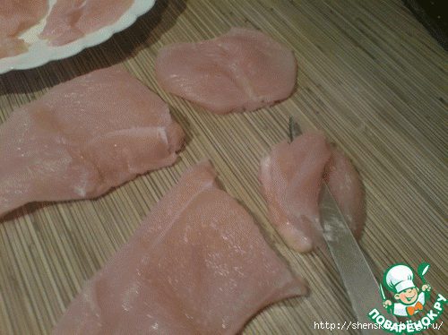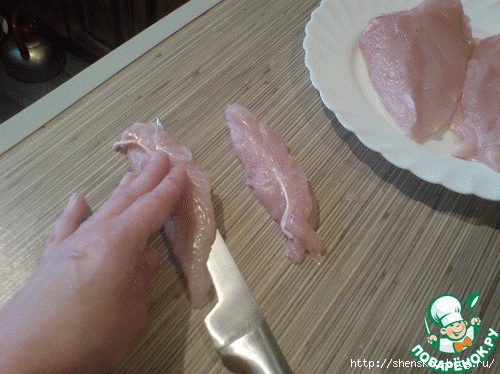 Далее отделяем ломтик шириной примерно 3 см с самой толстой стороны филе и опять делаем "бабочку". Уже восемь!