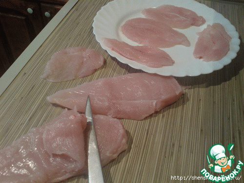 Теперь срезаем ломтик толщиной 0.5 см, начиная с самой толстой части филе до середины. У нас еще две отбивные, уже шесть!