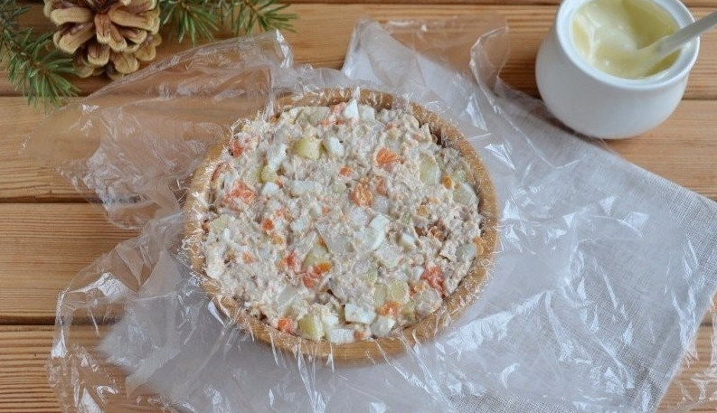 Застилаем салатник пищевой пленкой, выкладываем салат и хорошо утрамбовываем.