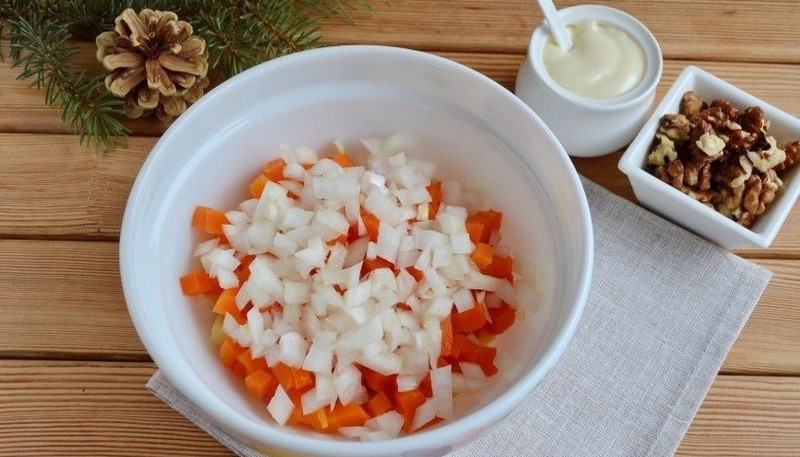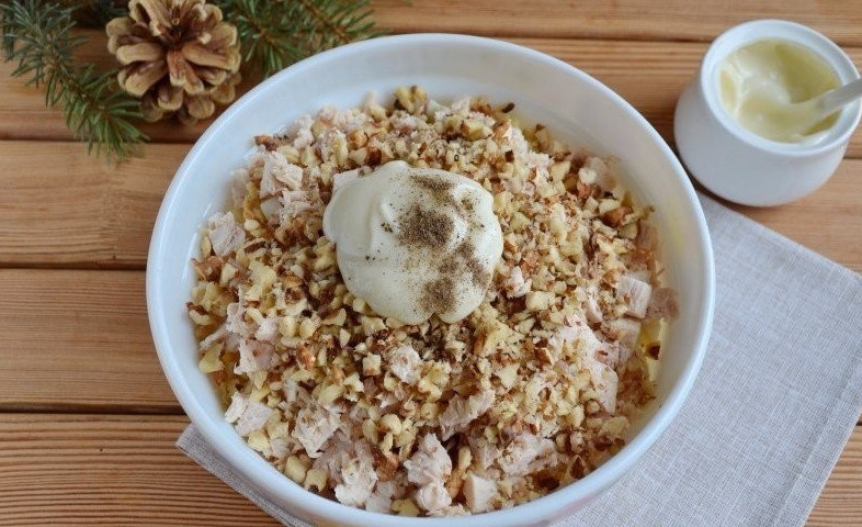 Острым ножом измельчаем грецкие орехи. Блендер лучше не использовать, так как получится слишком мелкая крошка. Выкладываем в салатник измельченные орехи, добавляем майонез, перчим и солим.