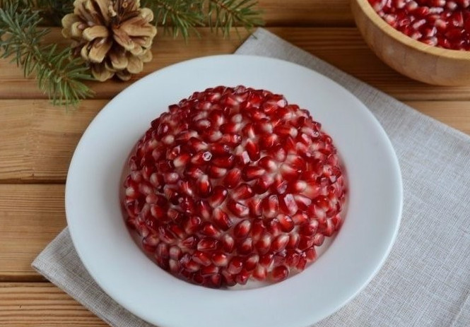 Смазываем салат майонез при помощи силиконовой кисточки или столовой ложки. Сверху выкладываем зерна граната, чтобы получилась «шапка».