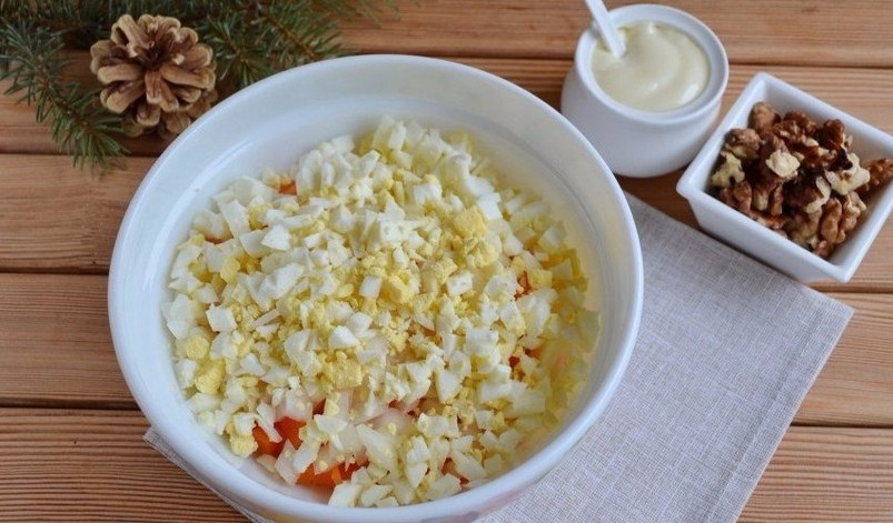 Яйца нарезаем кубиками, один желток предварительно откладываем, он понадобится для украшения салата.