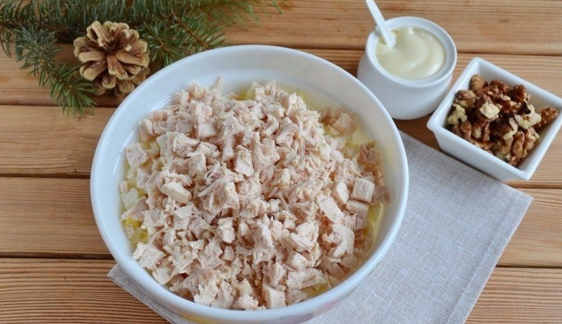 Куриное филе также нарезаем кубиками, добавляем в салатник.