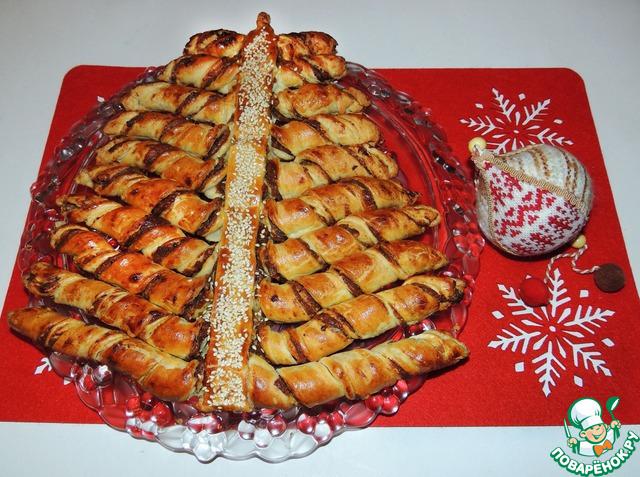 Наложить сверху вторую заготовку и скрутить жгутами "ветки" будущей елочки. У меня осталось немного начинки - я распределила ее по "стволу" и накрыла полоской из остатков теста.