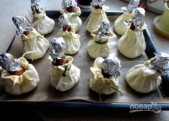 6. Лист смочить ледяной водой. Выложить мешочки на противень. Выпекать при температуре 220 С в течение 5-7 минут, затем уменьшить температуру до 180 С и допекать 15-20 минут до золотистого цвета.