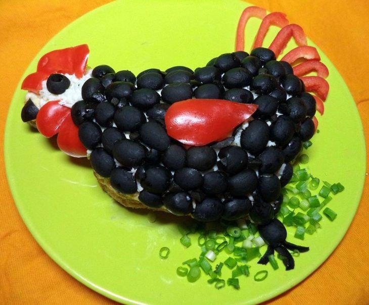 Я еще сделала черного петуха (это половинки маслин. Если между ними были большие пробелы, засыпала из кусочками мелко нарезанных маслин).