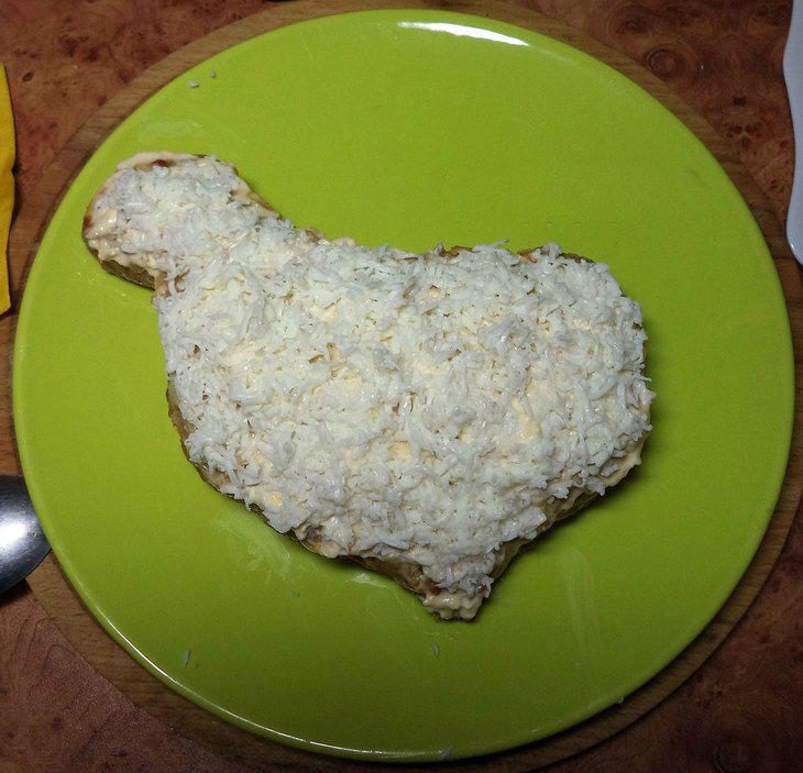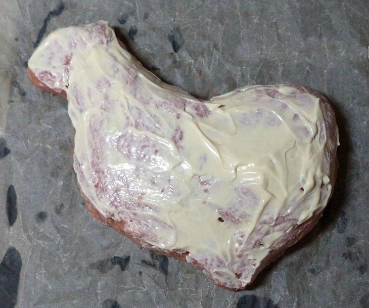 Сформировать фигурку петуха на противне. Силуэт мясного петуха можно представить как сердце с ответвлением слева (или справа) вверху (это голова с шеей). То есть, вылепляете сердечко и к нему присобачи- (то есть, приклеиваете) голову, в которой формируете клюв. Сверху петуха надо смазать майонезом (обратной стороной ложки распределить майонез по поверхности петуха).