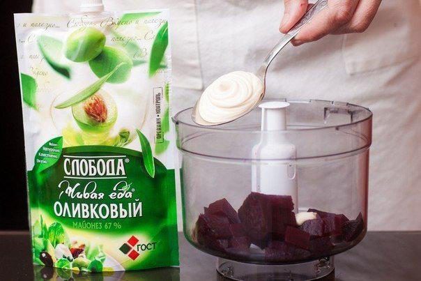 2. Положить свеклу в блендер, добавить майонез, чуточку посолить, посыпать молотым кориандром и измельчить до состояния пюре.
