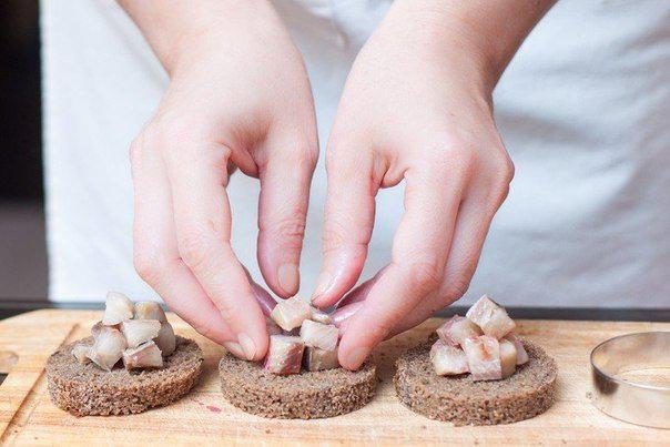 5. Горкой положите на хлеб кусочки филе малосольной селедочки.