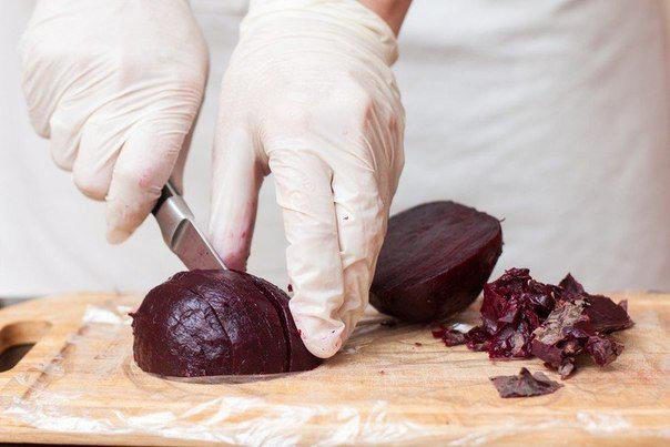 * Поскольку свекла сильно красит руки, я надела перчатки, чтобы потом не пугать вас своими "кровавыми" пальцами.