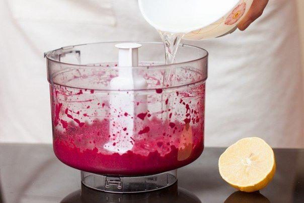 3. Влить лимонный сок и попробовать свекольное пюре на вкус. Оно должно быть приятного кисло-сладкого вкуса. Желатин подогреть (не доводить до кипения!) и влить в пюре. Снова включить блендер и взбить до гладкой нежной массы.