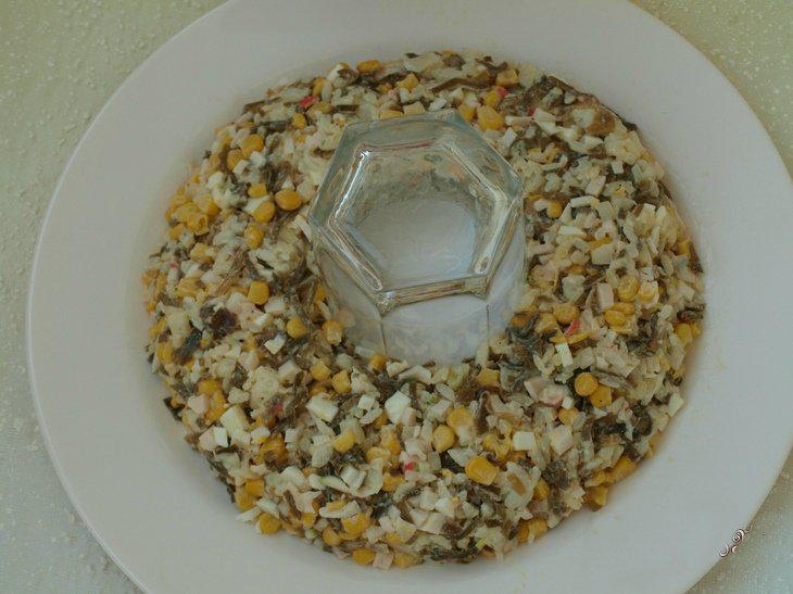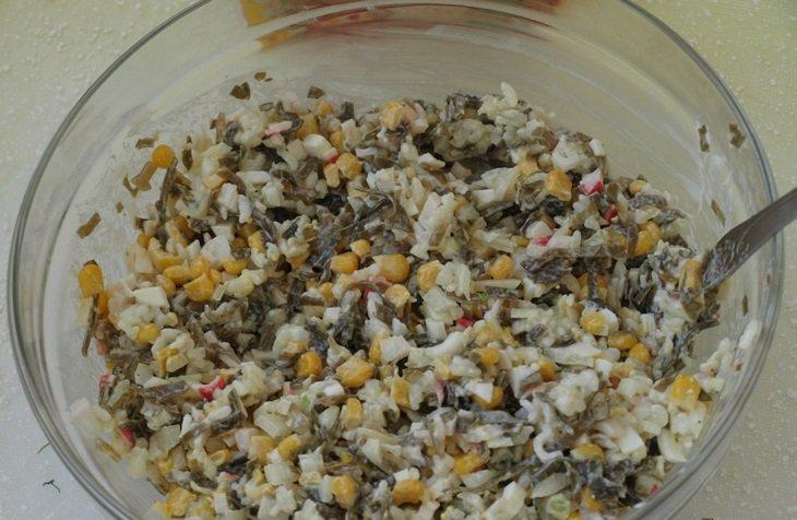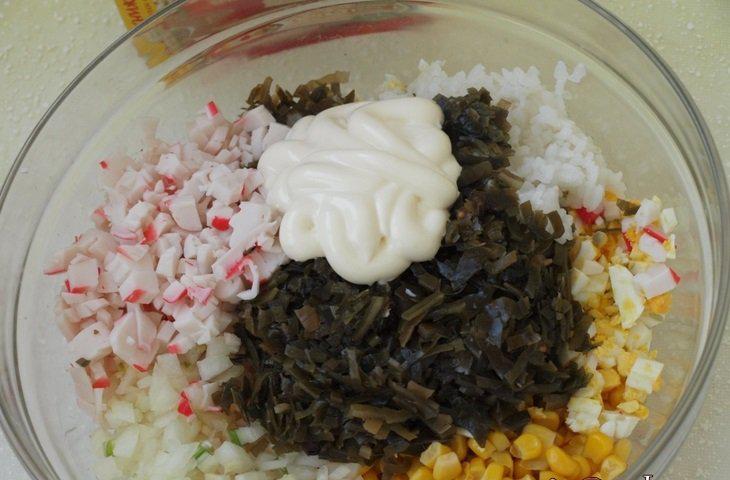 В миске смешать рис,крабовые палочки,лук,яйца,консервированную кукурузу и морскую капусту.Добавить майонез.