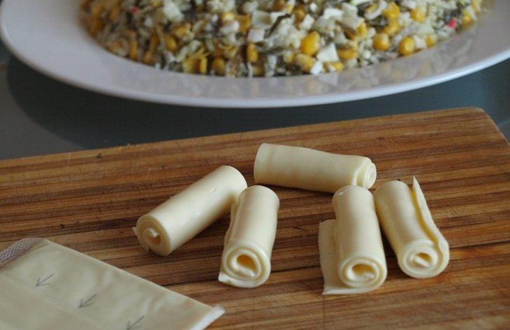 Для свечей используем плавленый сыр для бутербродов.Скатываем каждый в трубочку и разрезаем пополам.