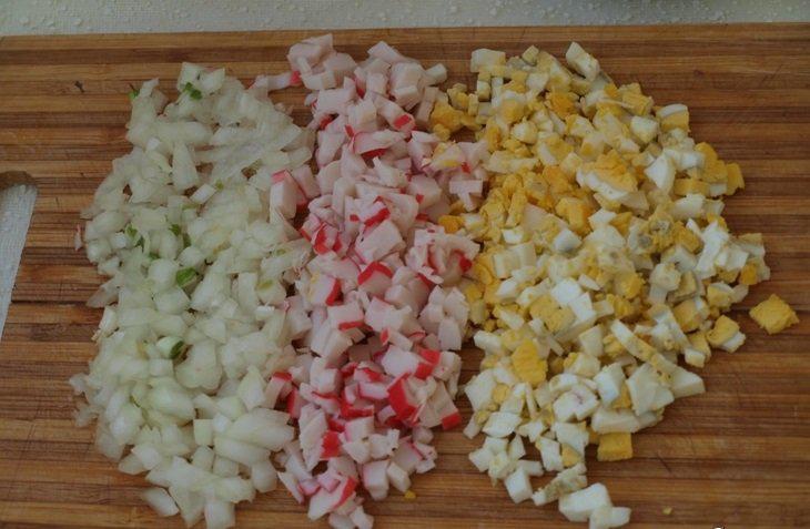 Кубиками нарезать лук,крабовые палочки и яйца.