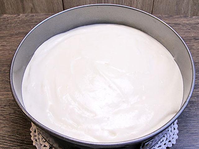 3. В разъемную форму застилаем пергамент и выливаем тесто. Никакого масла не добавляем, не смазываем, иначе корж не поднимется!