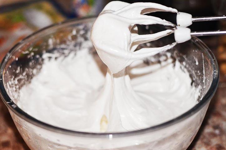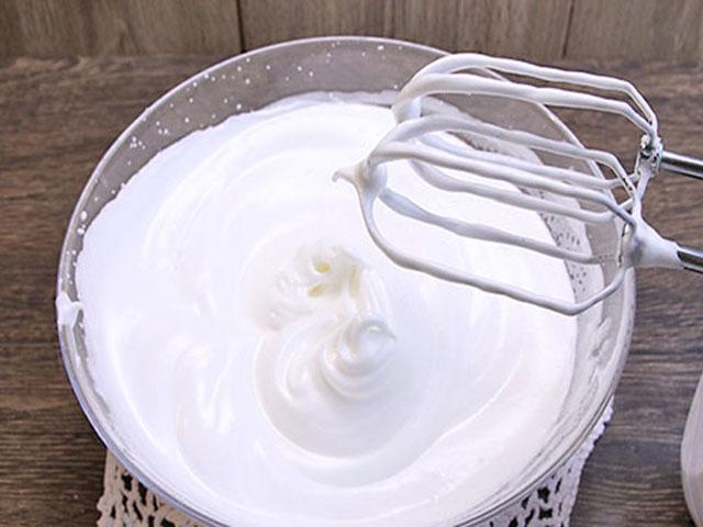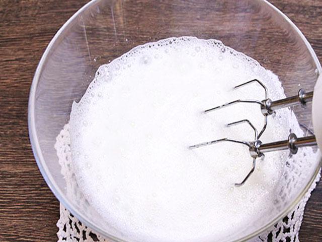 Взбиваем их до легкой пенки, а затем постепенно вводим сахар, не переставая мешать.