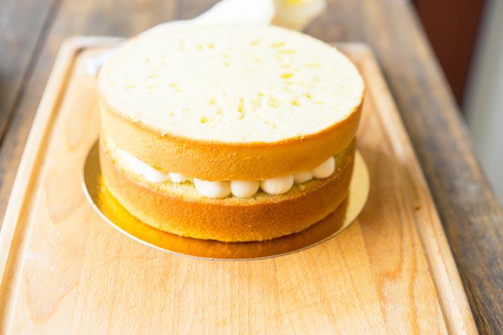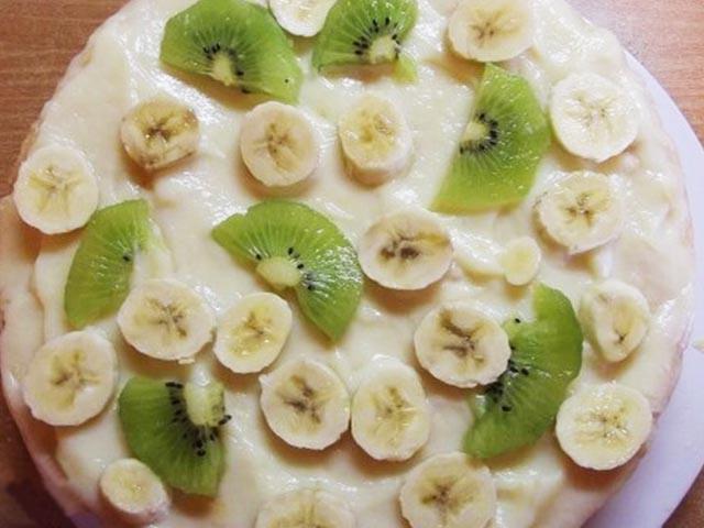11. А затем визуально делим оставшийся крем на четыре части. Первыми тремя промазываем коржи, укладывая их друг на дружку. Не забываем про начинку из фруктов, кладем их поверх сладкой массы.