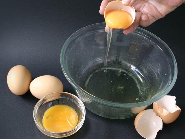 6. А также готовим белковый крем, которым будем украшать поверхность готового угощения. Для этого в высокую керамическую или стеклянную миску, можно и нержавейку, выливаем обязательно холодные белки.