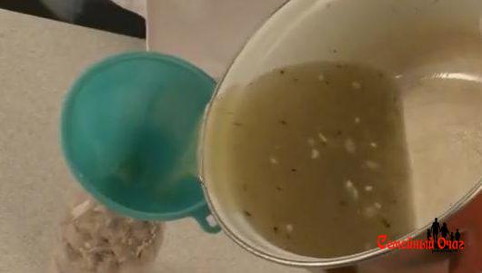 Бульон процедите через сито, а затем влейте через воронку в бутылку. Закройте крышкой и поставьте в холодильник застывать на ночь.