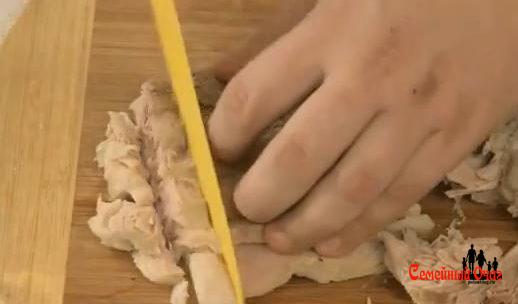 Выньте мясо из бульона, дайте ему остыть, затем отделите все от косточек и порежьте на небольшие кусочки.