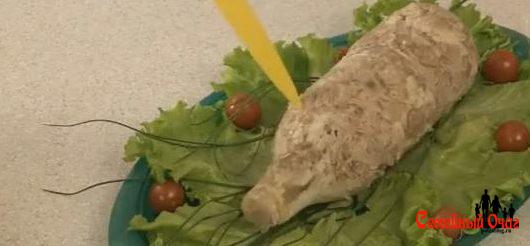 Затем аккуратно острым ножом проткните бутылку и извлеките ее. Как это сделать проще? Нужно порезать ее напополам, а потом просто две половинки мясного рулета приложить вместе.
